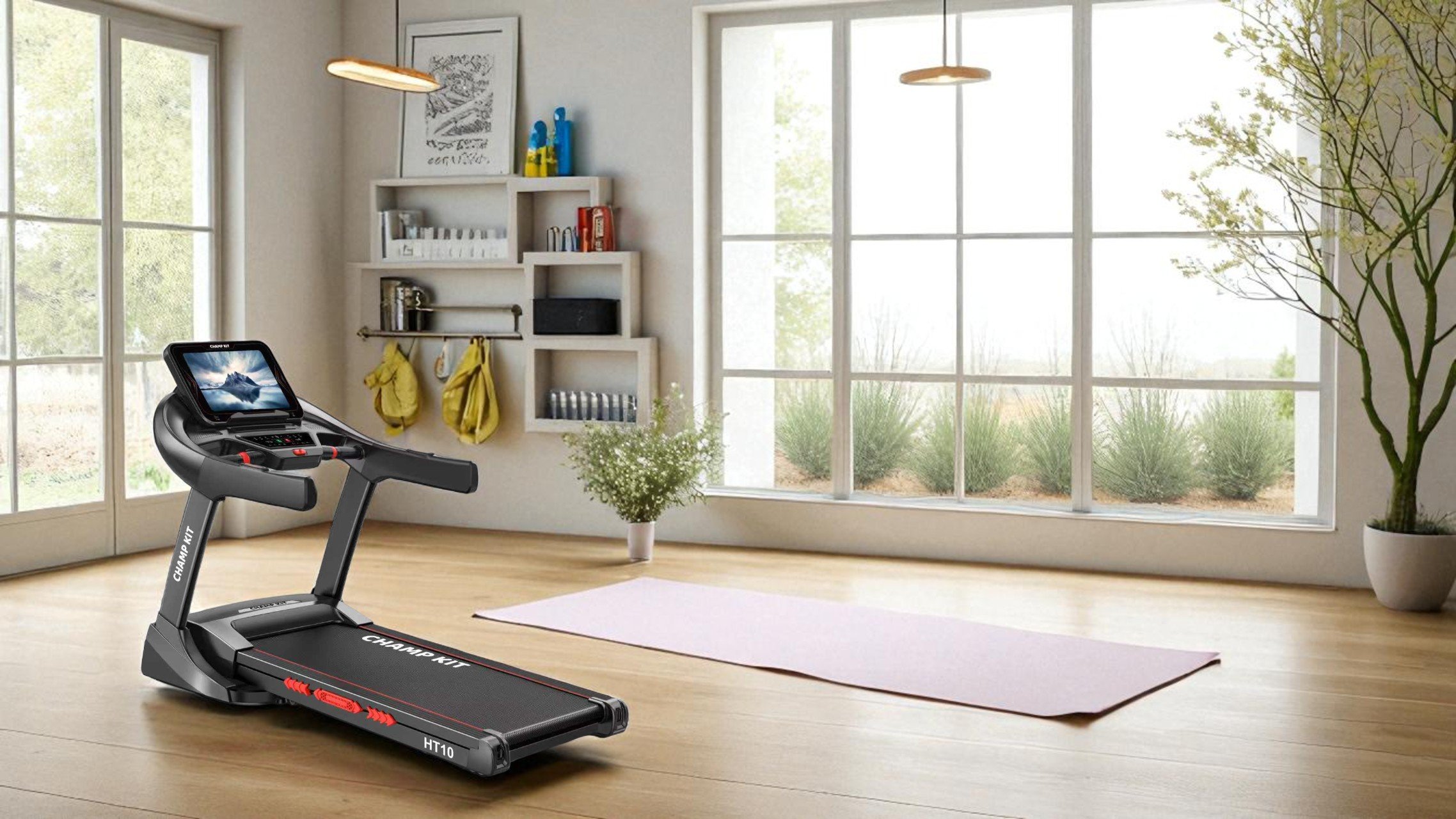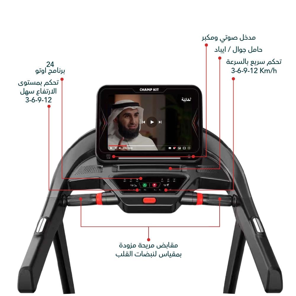- شاشة رقمية حديثة مع حامل للأيباد أو الهاتف لمتابعة الفيديوهات أو التمارين التفاعلية.