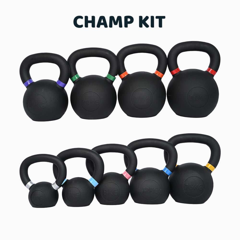 يتكون البكج من 9 قطع أوزان كيتل بيل تبدأ من 4 كيلو وحتى 32 كيلو ويتميز كل وزن بلون وحجم مختلف عن الآخر لسهولة التعرف عليه من بعيد. يعد هذا البكج خيار ممتاز للصالات الرياضية ويناسب جميع المستويات من المبتدئين والمحترفين سواء كان الهدف زيادة اللياقة وحرق الدهون أو كسب العضلات فتمارين الكيتل بيل من افضل الخيارات لدى لاعبين الكروسفت.