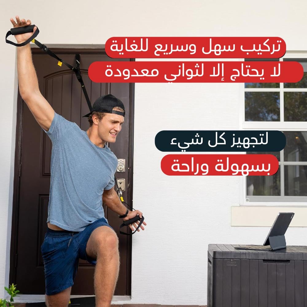 - علّق الحبال بسهولة على باب متين أو عمود ثابت، وابدأ في أداء تمارينك فوراً. سواء كنت في المنزل، الحديقة، المكتب، أو حتى في عطلتك، لن يعيقك شيء عن الوصول إلى مستويات جديدة من القوة واللياقة.